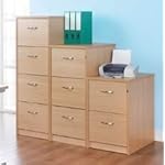 Deluxe 3 drawer filing cabinet. 3 Lockable filing drawers (with 2 keys supplied) with chrome handles. Complete with anti-tilt mechanism and 25mm top. 100% extension ball bearing runners with a 45kg drawer weight loading. Accomodates foolscap files only. Available in beech, oak, maple, white or walnut.