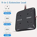 BOPUROY Extension Lead Surge Protector Power Strip with 4 AC Socket + 1 USB C + 4 USB A Ports